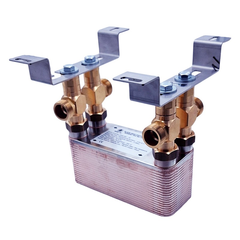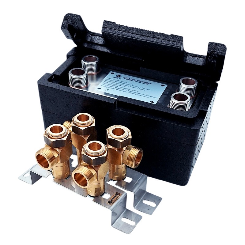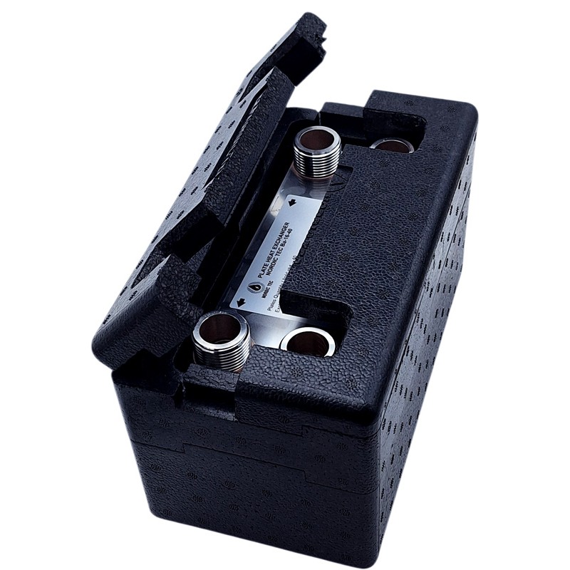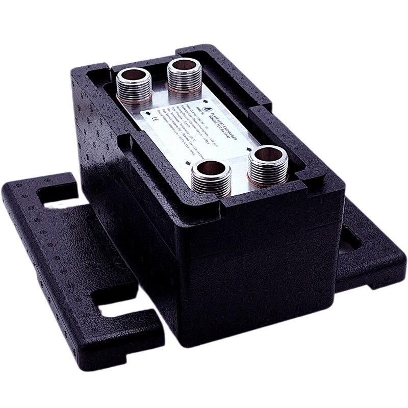50 kW brazed plate heat exchanger – traditional model with four 1-inch outlets.