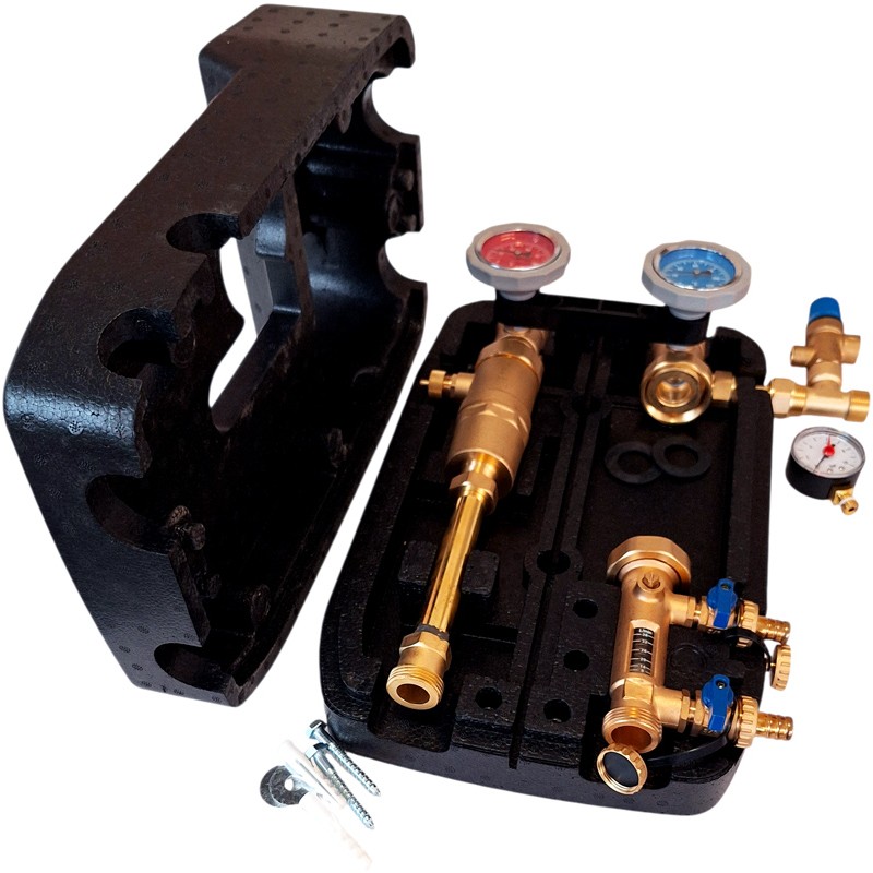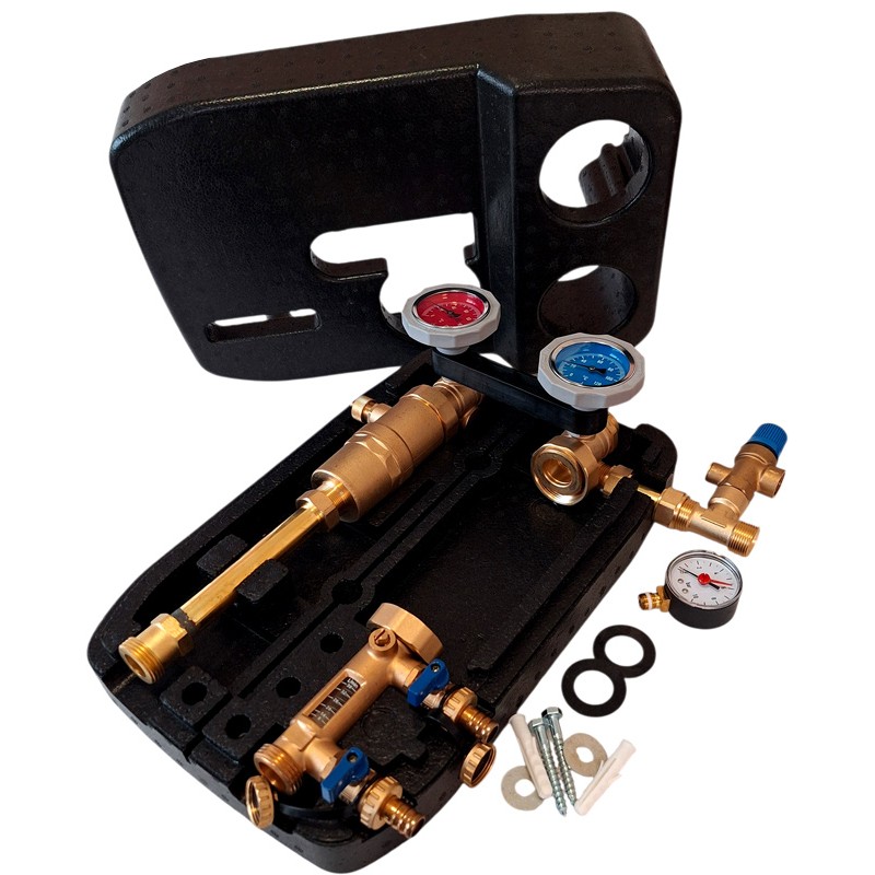 - typically consists of two shut-off valves, a place for the circulation pump, rotameter, safety valve, pressure gauge, and air separator
