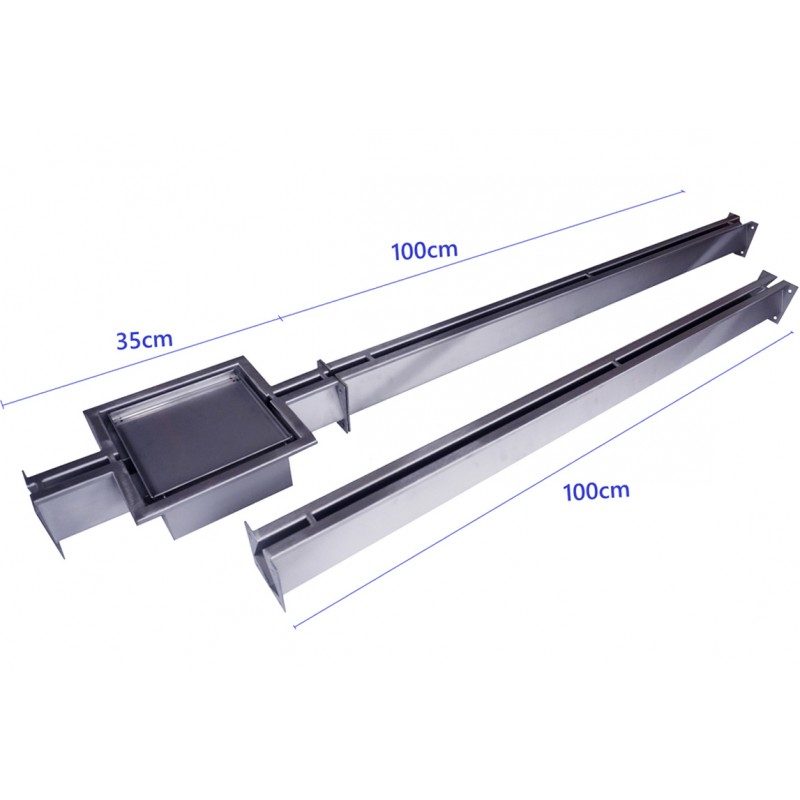 Every industrial slot drainage channel set from this offer includes a drain grate, i.e., the basic element. Including the connections for the Inox arms, i.e., the water collection channels, it measures 35cm - which must be considered when planning the purchase and installation. This is the drainage element that connects to the sewerage and has a DN50 water outlet, visible in the photos.