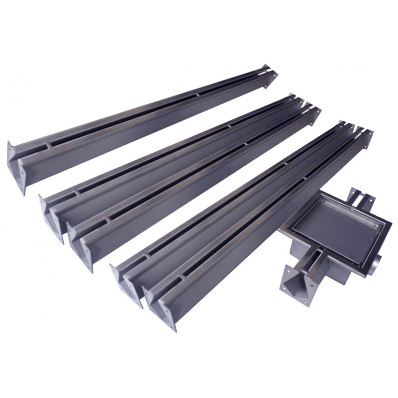 The INOX drainage channel - or linear garage slot drain for concrete floor, from this offer, is a drainage system containing 6, 5, 4, 3, or 2 arms - meaning there is a choice of variants available. Every arm is a separate module channel with the length of 1 aditional meter.